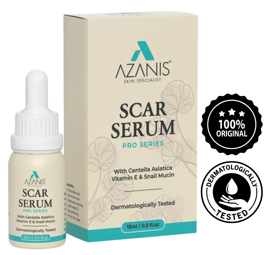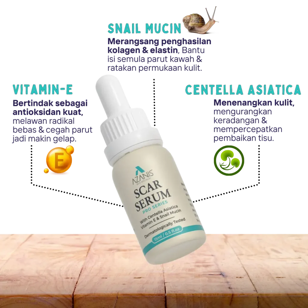 Guna dropper khas → titiskan beberapa titik Azanis Scar Serum Pro Series terus pada parut. Formula Snail Mucin & Centella Asiatica memberi kesan pantas pada kawasan bermasalah.